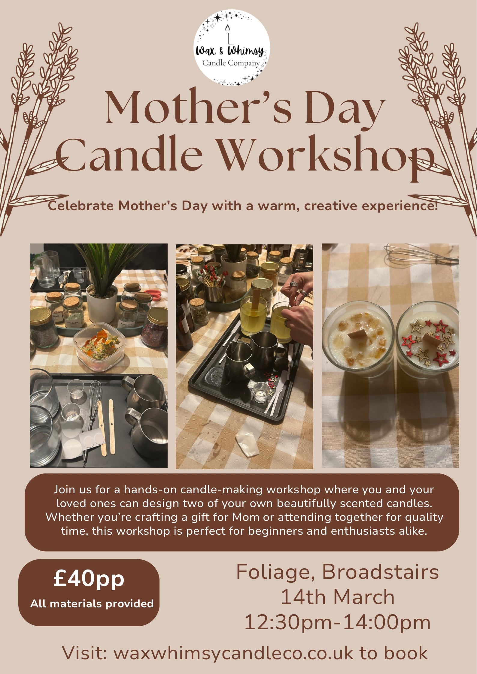 Join us for a hands-on candle-making workshop where you and your loved ones can design your own two beautifully scented 30cl candles. Whether you’re crafting a gift for Mom or attending together for quality time, this workshop is perfect for beginners and enthusiasts alike.